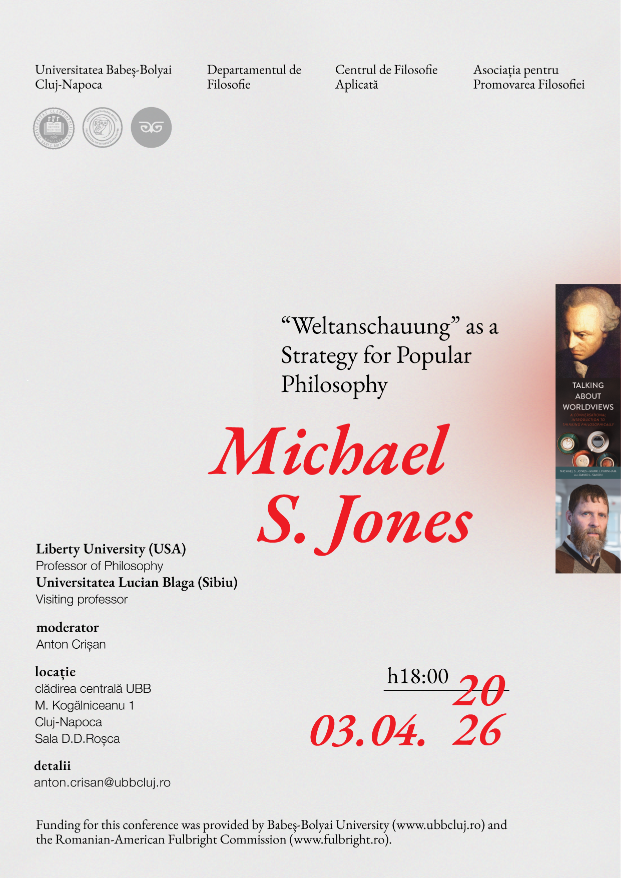 Facultatea de Istorie și Filosofie prin Centrul de Filosofie Aplicată și Asociația pentru Promovarea Filosofiei vă invită la conferința Weltanschauung as a Strategy for Popular Philosophy susținută de către Dr. Michael S. Jones (Liberty University/SUA & Universitatea Lucian Blaga din Sibiu). Evenimentul va avea loc vineri, 3 aprilie 2026, de la ora 18.00, în sala D.D. Roșca, Clădirea Centrală a UBB Cluj-Napoca, str. M. Kogălniceanu nr. 1, etaj 1. Conferința se va desfășura în limba engleză.