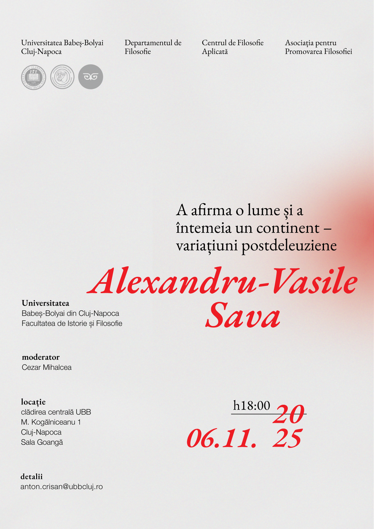 Facultatea de Istorie și Filosofie prin Centrul de Filosofie Aplicată și Asociația pentru Promovarea Filosofiei vă invită la conferința A afirma o lume și a întemeia un continent – variațiuni postdeleuziene susținută de către dr. Alexandru-Vasile SAVA (Facultatea de Istorie și Filosofie, Departamentul de Filosofie). Evenimentul va avea loc joi, 6 noiembrie 2025, de la ora 18:00 în sala Goangă, Clădirea Centrală a UBB Cluj-Napoca, str. M. Kogălniceanu nr. 1, etaj 1.