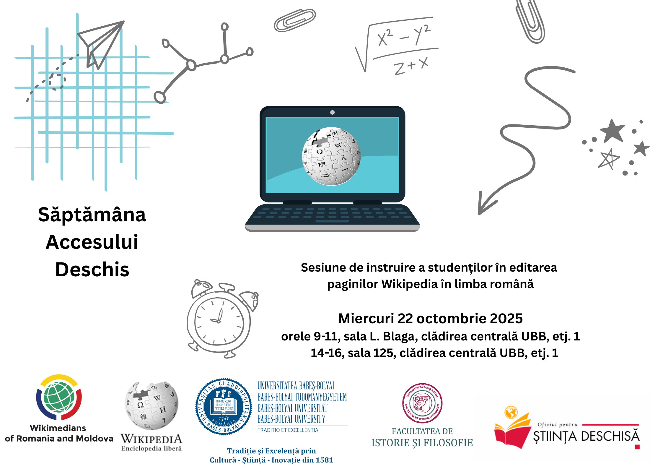Universitatea Babeș-Bolyai Cluj-Napoca, Oficiul pentru Știință Deschisă, Facultatea de Istorie și Filosofie, Facultatea de Litere și Grupul de editori voluntari Wikimedians of Romania and Moldova organizează împreună o sesiune de instruire a studenților în editarea paginilor Wikipedia în limba română referitoare la acces deschis și știință deschisă, în format online, miercuri, 22 octombrie, orele 9-11 și 14-16. Evenimentul face parte din seria de activități organizate în cadrul campaniilor Wikipedia „Săptămâna accesului deschis 2025” și „Săptămâna accesului deschis la Universitatea Babeș-Bolyai din Cluj-Napoca (2025)”. Pentru mai multe detalii despre campanie și despre cum puteți participa și contribui accesați link-ul:
