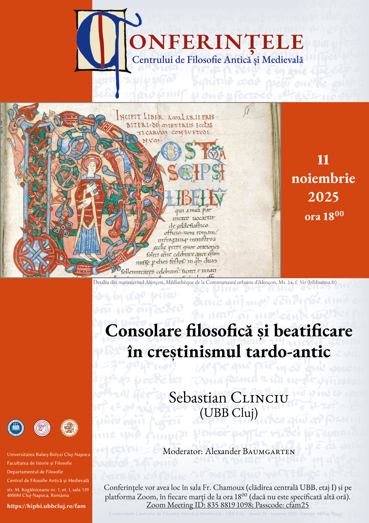 Conferinţele vor avea loc în sala Fr. Chamoux (clădirea centrală UBB, etaj 1) și pe platforma Zoom, în fiecare marţi de la ora 18.00 (dacă nu este specificată altă oră).