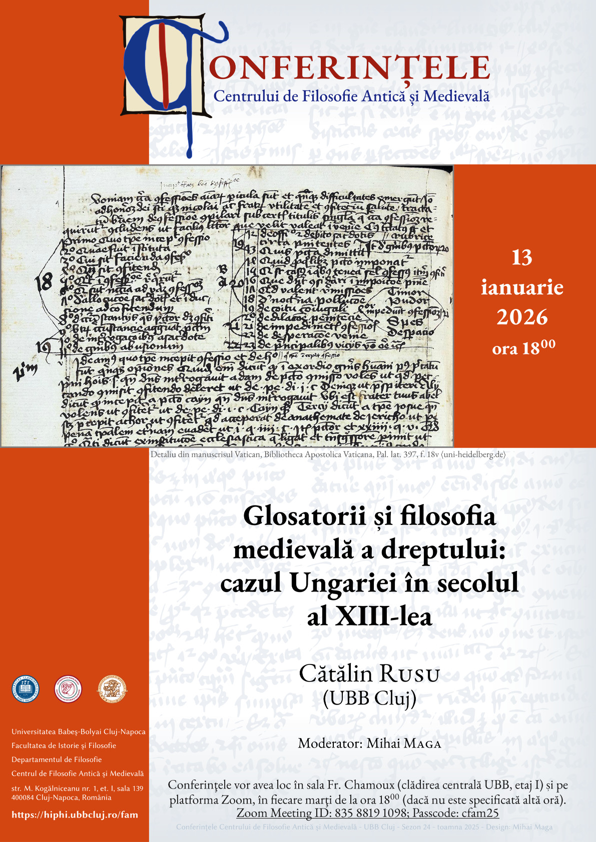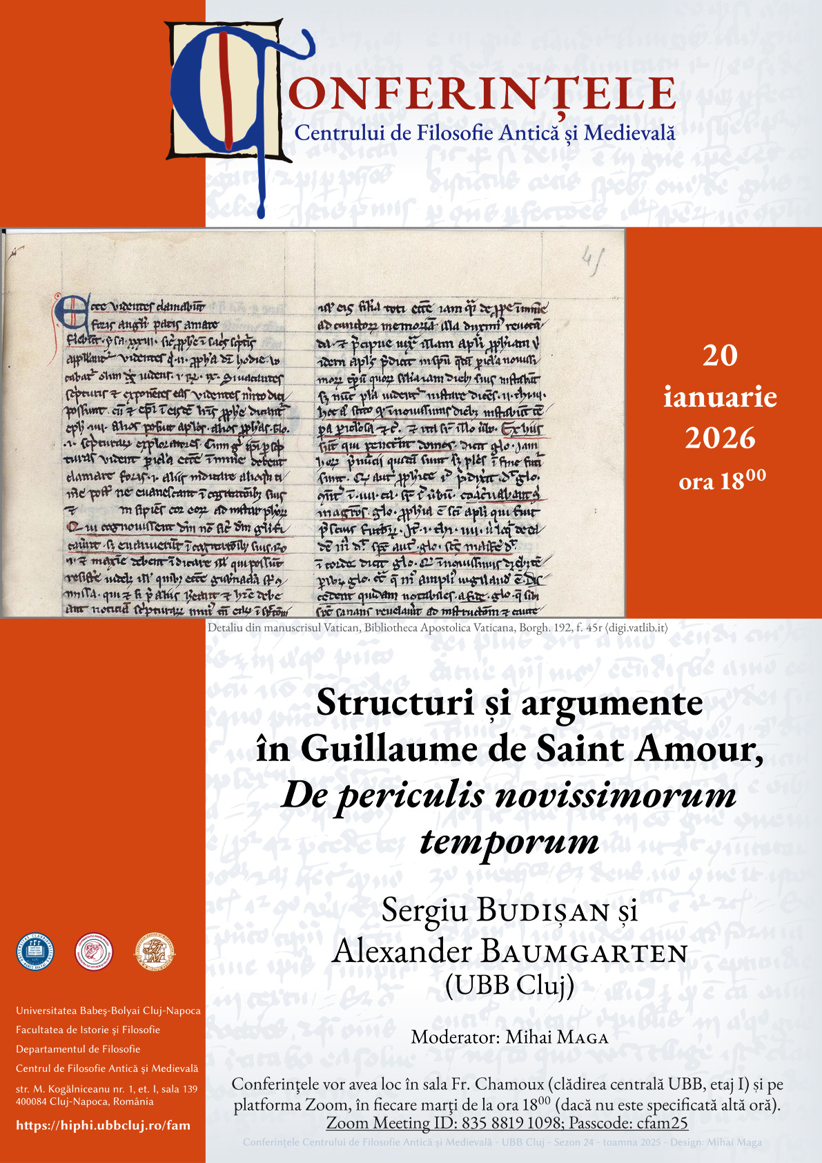 Conferinţele vor avea loc în sala Fr. Chamoux (clădirea centrală UBB, etaj 1) și pe platforma Zoom, în fiecare marţi de la ora 18.00 (dacă nu este specificată altă oră).