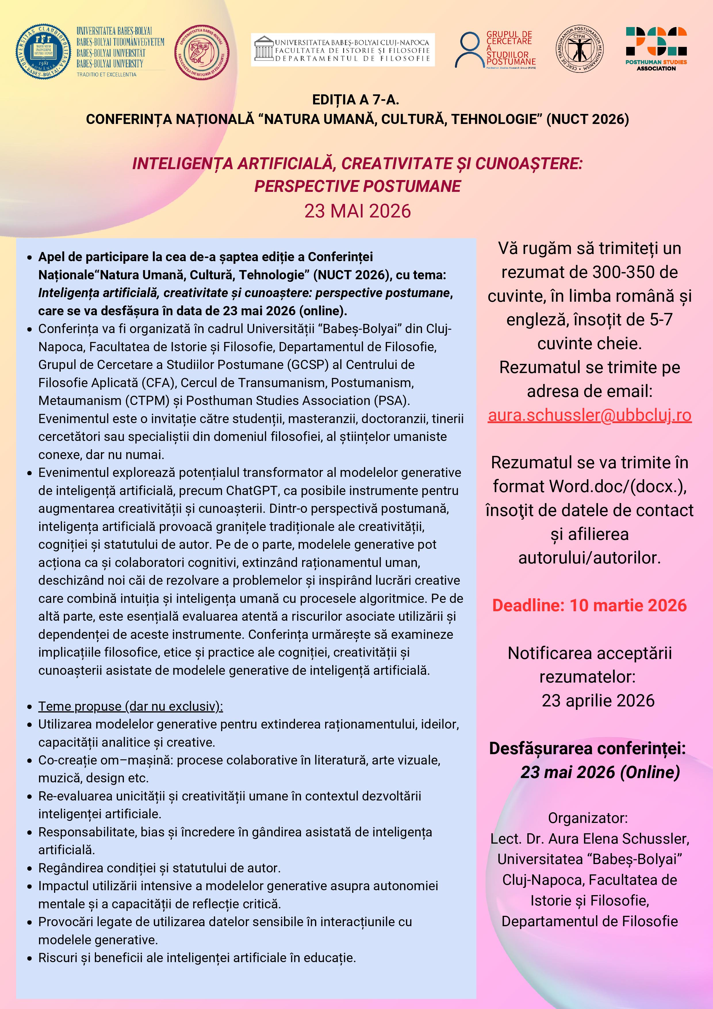 Apel de participare la cea de-a șaptea ediție a Conferinței Naționale “Natura Umană, Cultură, Tehnologie” (NUCT 2026), cu tema: Inteligența artificială, creativitate și cunoaștere: perspective postumane, care se va desfășura în data de 23 mai 2026 (online).