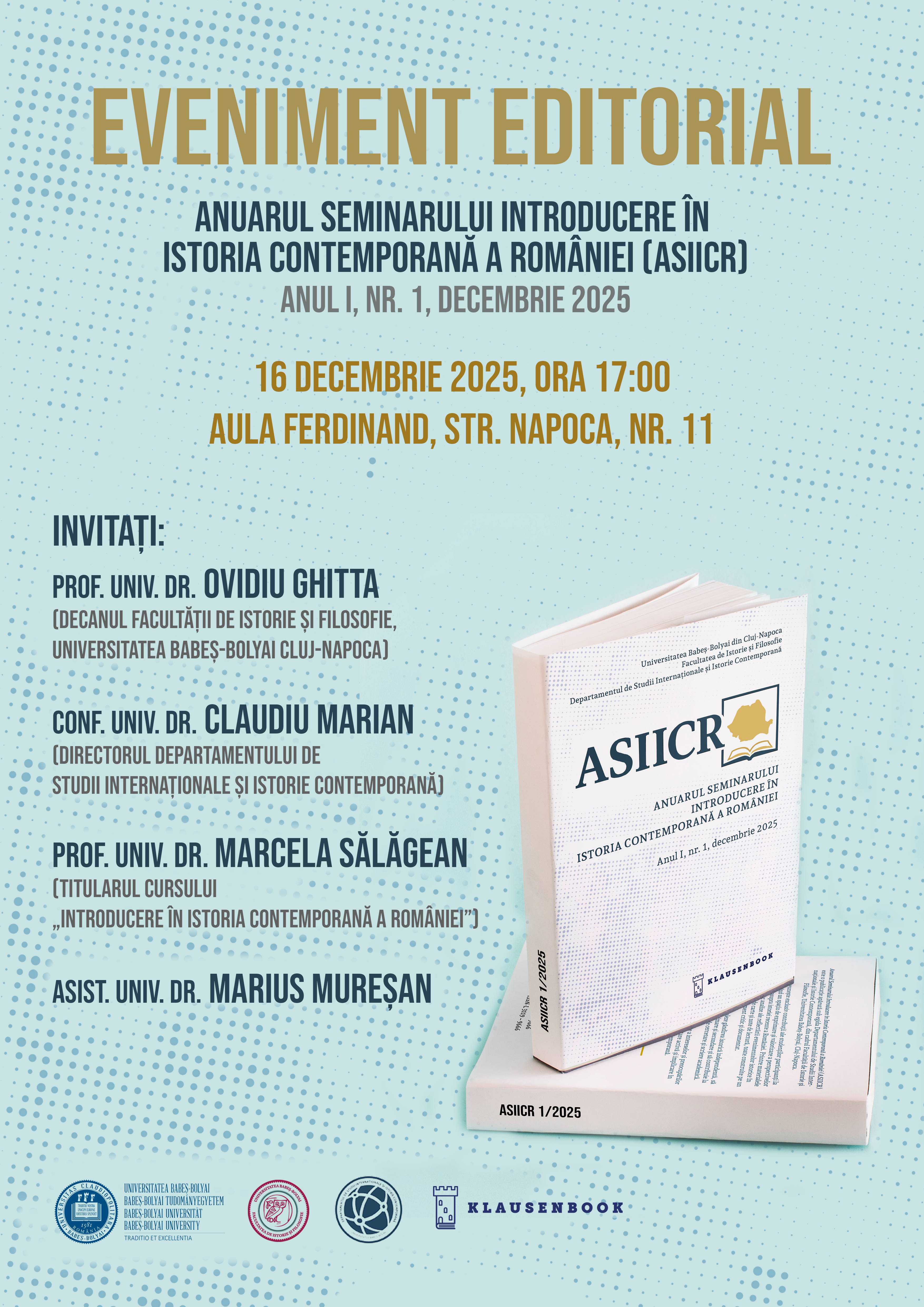 Departamentul de Studii Internaționale și Istorie Contemporană al Facultății de Istorie și Filosofie vă invită marți, 16 decembrie 2025, de la ora 17:00, în Aula Ferdinand (str. Napoca, nr. 11), la evenimentul dedicat lansării „Anuarului Seminarului Introducere în Istoria Contemporană a României” (ASIICR), coordonat de asist. univ. dr. Marius Mureșan.