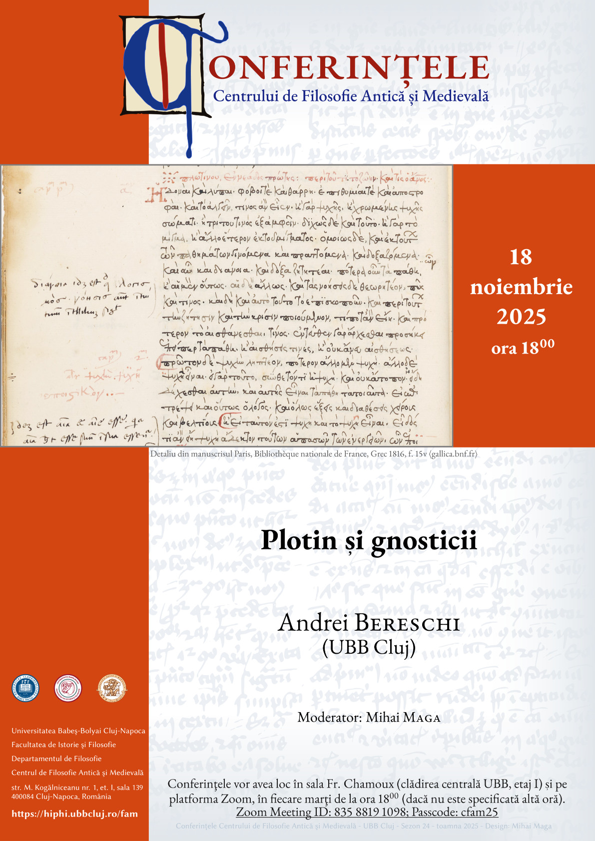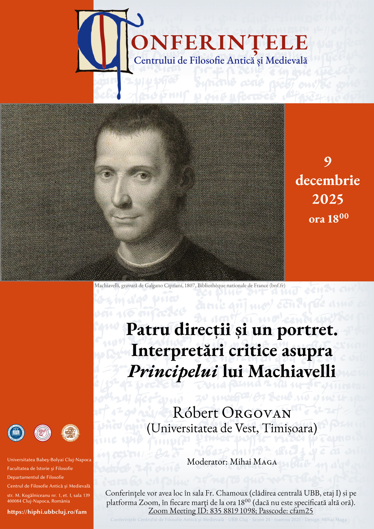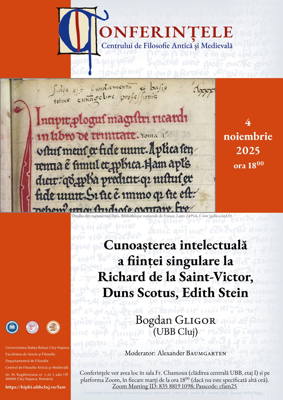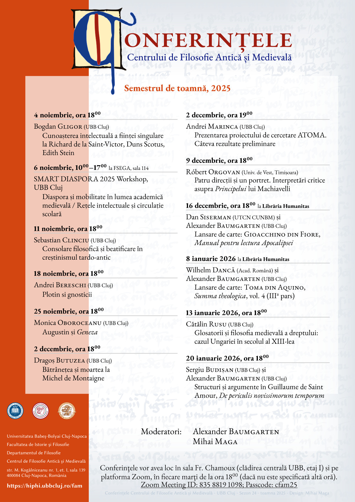Conferinţele vor avea loc în sala Fr. Chamoux (clădirea centrală UBB, etaj 1) și pe platforma Zoom, în fiecare marţi de la ora 18.00 (dacă nu este specificată altă oră).